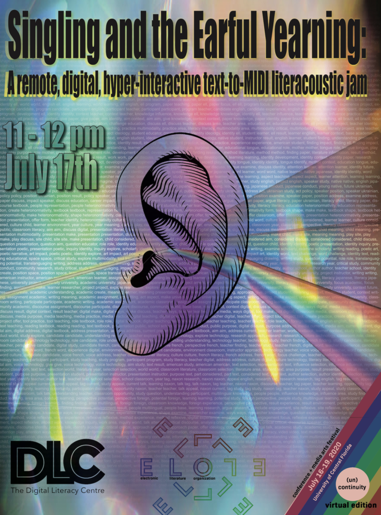 This is the debut show of Singling, a new text sonification software we have developed to analyze and otherwise perform string data, choosing from a wide variety of linguistic and musical parameters and multilevel parsing of text. Virtual attendees of the performance will be invited to share their thoughts, reactions, poems, and codework with us through the chat function of the video conferencing platform; our program can translate all manner of keyboard symbols, numbers, the English alphabet as well as various classes of words into MIDI code. We will perform the output of this textual data live, using a variety of MIDI-enabled instruments and digital interfaces. Each “song” will take a new portion of text to demonstrate particular settings and parameters for the transmediation of linguistic input to musical output, and feature different combinations of presenter-performers / instruments performing the MIDI code. Through screen sharing, we will show and narrate the choice of text, various settings and combinations of instruments used for each song, and then remotely perform it. Attendees are encouraged to use audio headphones or sound systems to hear the full range of audio frequencies.