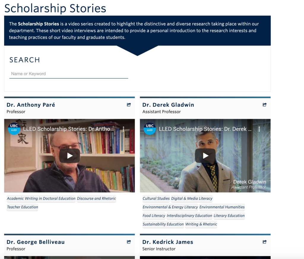 I filmed and edited a series of videos for UBC’s Language and Literacy Education Department promoting scholars and their research.